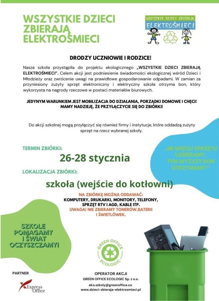 „Wszystkie dzieci zbierają elektrośmieci”. Nasza szkoła w dniach 26-28 stycznia  organizuje zbiórkę elektrośmieci (komputery, drukarki, monitory, telefony, sprzęt RTV i AGD, kable itp.) Lokalizacja: szkoła, wejście do kotłowni. Co w zamian: świadomość ekologiczna oraz bon dla szkoły na materiały biurowe.